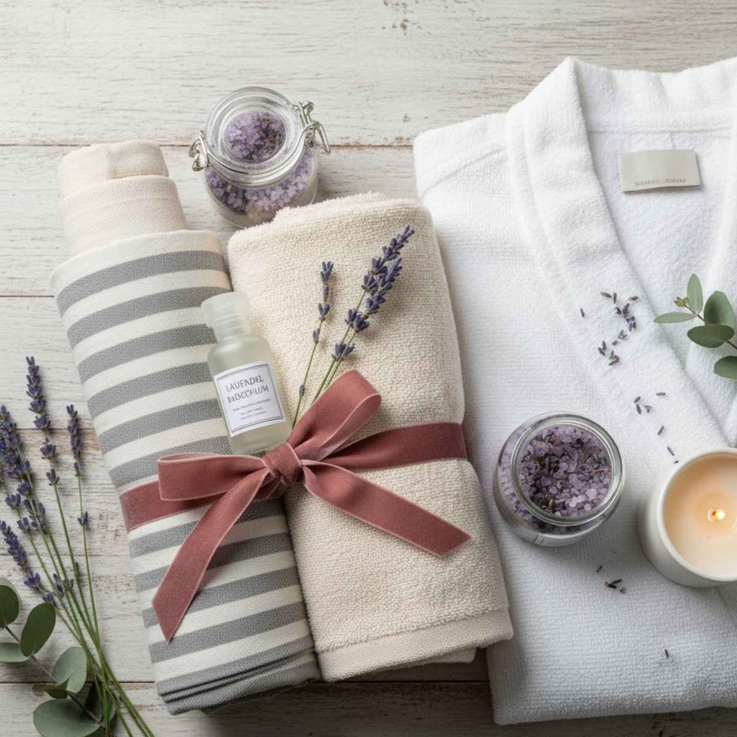 Tip voor de basis: Begin altijd met een neutrale, hoge kwaliteit handdoek of badjas. Zo kun je eindeloos variëren met gekleurde lintjes, accessoires en bijpassende geuren.